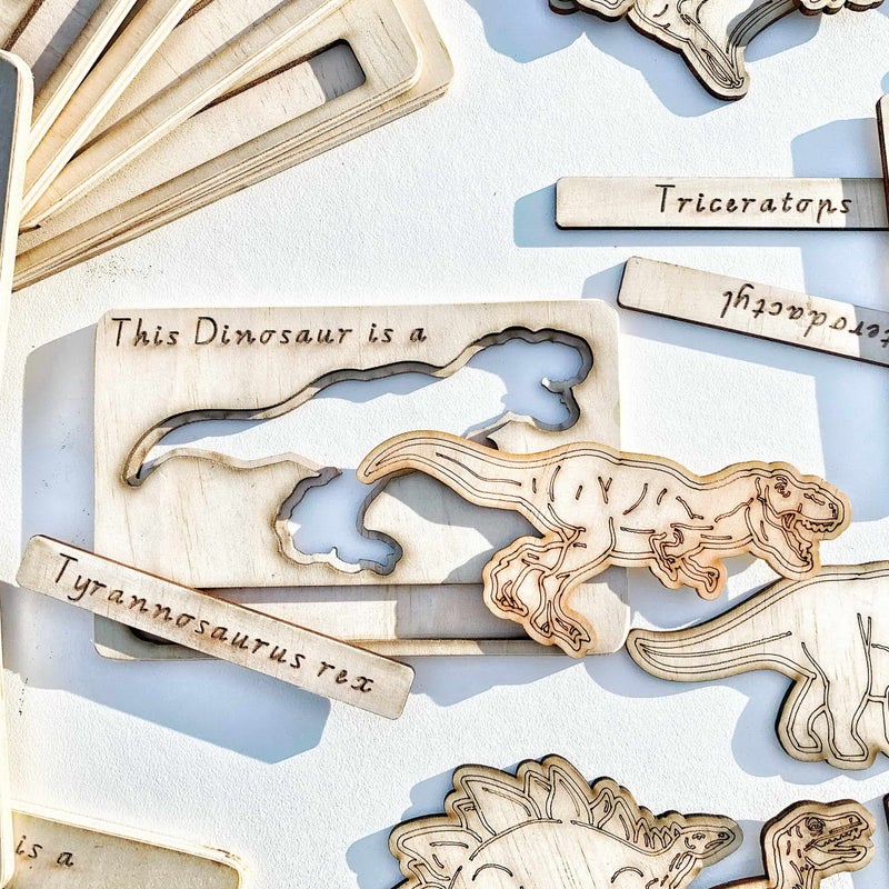This set comes with 10, 2-sided dinosaur wooden cards, 10 Dinosaur Cutouts and 10 Dinosaur name tags.