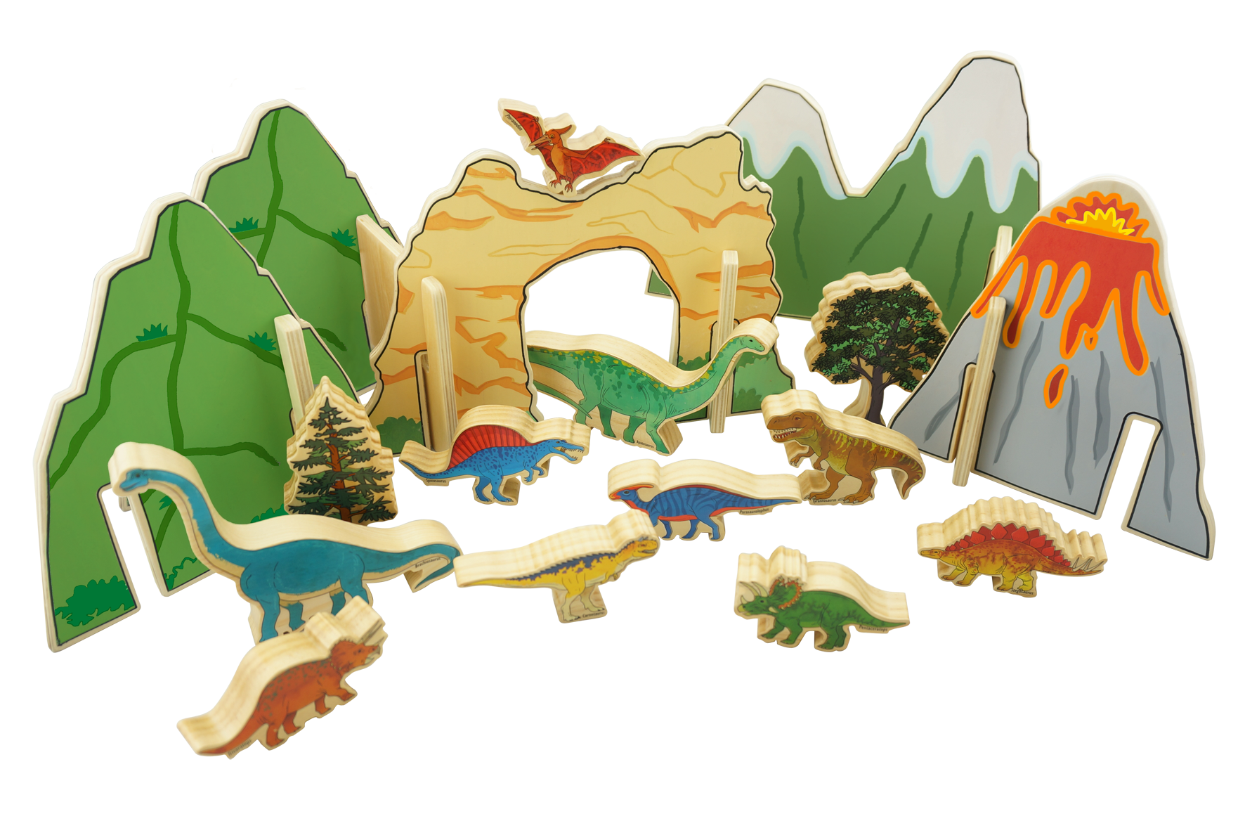 Watch the dinosaurs come alive with this colourful prehistoric small world wooden set that includes 10 dinosaurs favourites (T-Rex, Triceratops, Spinosaurus and Brachiosaurus to name a few). This set comes complete with a prehistoric landscape of mountains, a volcano, trees and cliffs with a cave. Your young adventurer’s imagination will be running wild role-playing while developing emotional and language skills. The beautifully illustrated images are printed using non-toxic heat transfer technology and sealed with a clear matte varnish to ensure they stay vibrant for years to come.