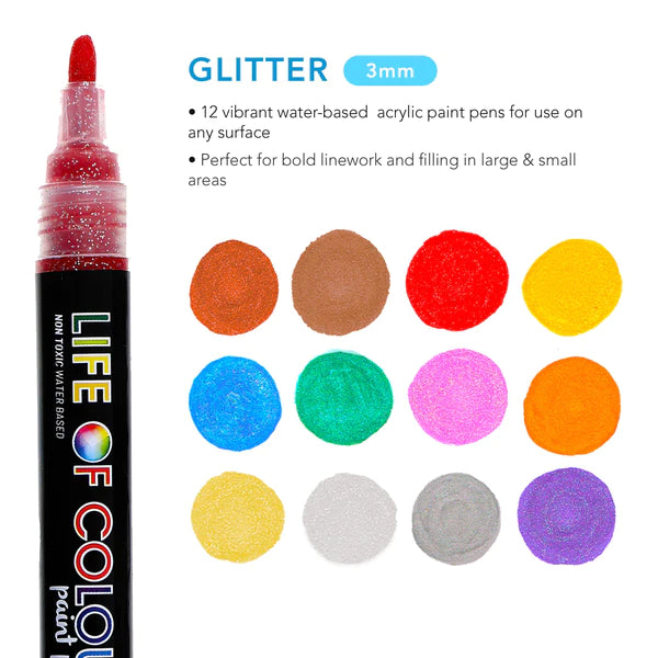 Glitter 3mm Medium Tip Acrylic Paint Pens - Set of 12