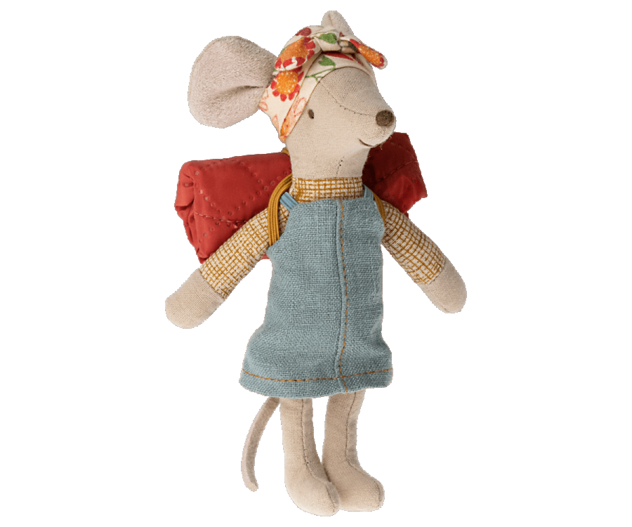 This mouse is well-prepared for a hiking trip in the wild nature. She is dressed for days of walking and brings her sleeping bag for the nights under the stars. This style has magnets in her hands.