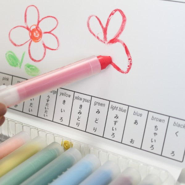 Colours of 12 Crayons included in set are: white, pink, red, orange, pale orange, yellow, yellow green, green, light blue, blue, brown and black.