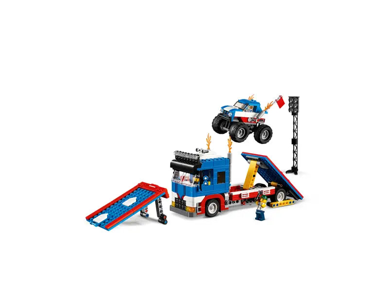 Deliver a spectacular performance with the LEGO® Creator 3in1 31085 Mobile Stunt Show set. Unload the monster truck and floodlight tower from the transporter, fold out the stunt ramps and you’re ready to start the show! The flatbed transporter also features 2 fiery exhaust stacks and a detailed driver's cab complete with a bed and TV. This 3in1 model rebuilds into a Hot Rod Pickup or 2 Dragster Racers for more exciting stunts and adventures. Includes 2 minifigures: a stuntwoman and her trusty mechanic.