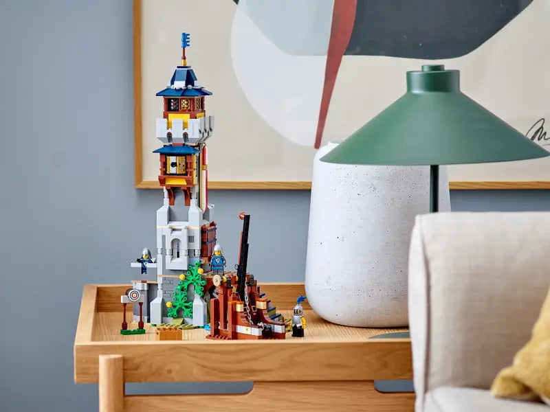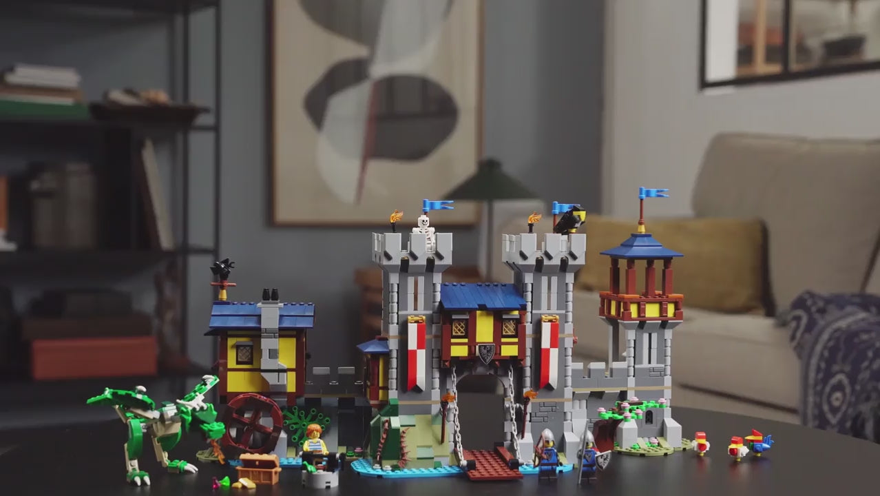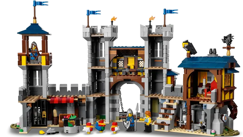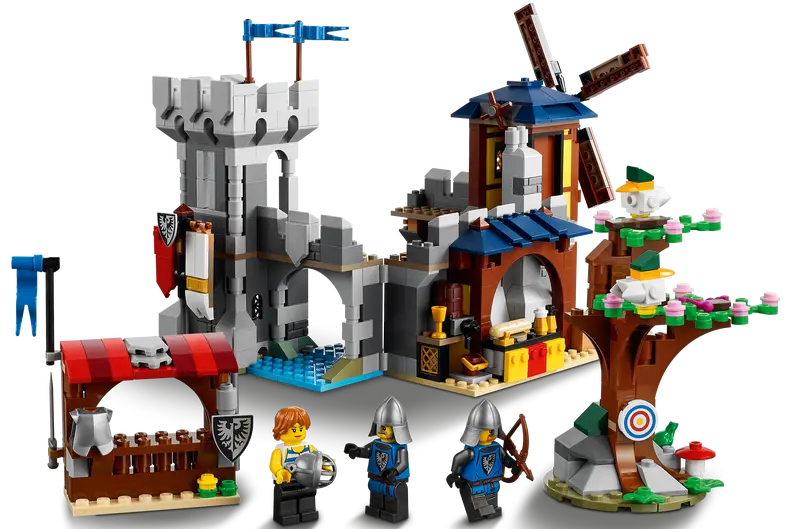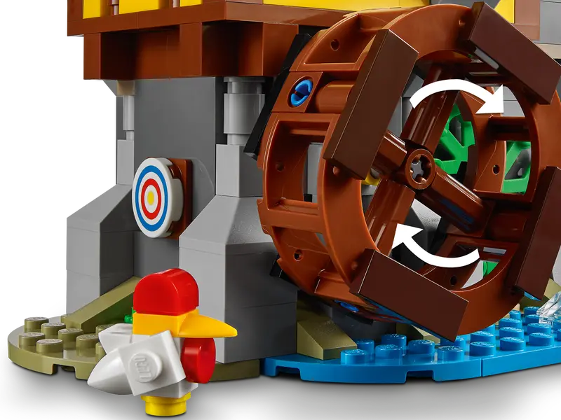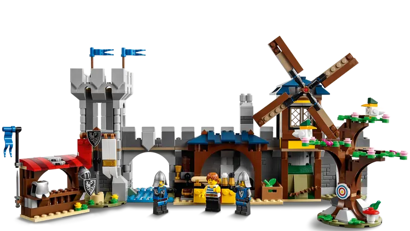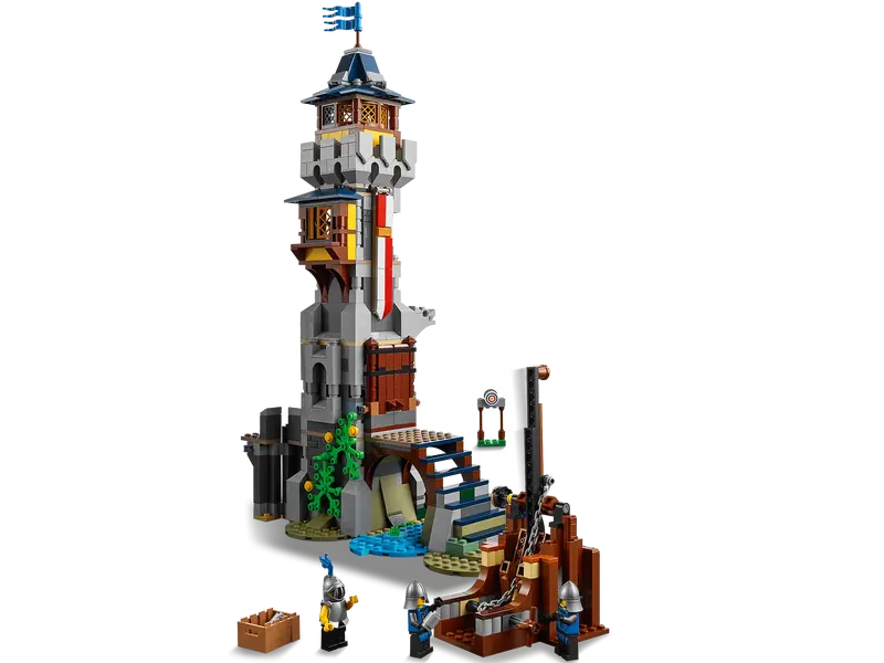 - The castle tower is accompanied by a working catapult toy, while the medieval marketplace features a water mill, guard tower and prison.