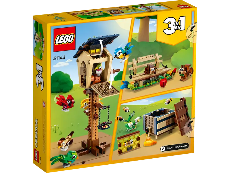 - 3in1 toy – LEGO® fans can play out enchanting animal stories with this LEGO Creator 3in1 Birdhouse (31143), featuring 3 scenes in 1: a birdhouse, park bench animals and a beehive